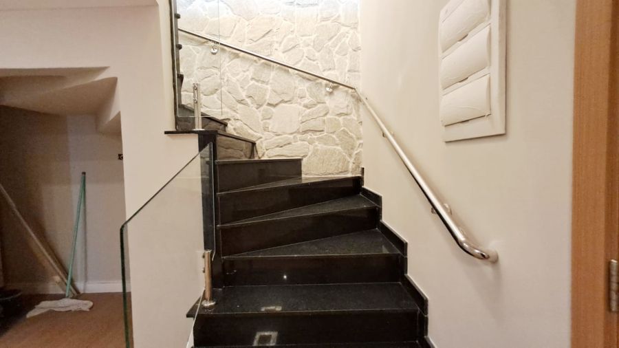 No primeiro andar, o descanso é sagrado: 3 suítes climatizadas com piso vinílico, sendo que a principal conta com uma hidromassagem para relaxar após um dia longo. Subindo, o living se abre para uma área gourmet espetacular com churrasqueira a carvão e fechamento em vidro, onde o horizonte é o seu limite.